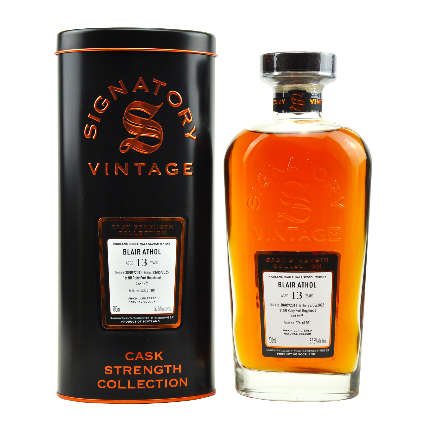 Land Schottland Inhalt 4cl Region Highlands VOL % 57.5 Jahrgang 2011 30.09.2011 - 23.05.2025 Alter 13 Destillerie Blair Athol Abfüller Signatory Vintage Anzahl Flaschen 301 Fass Nr. 9 Fass 1st Fill Ruby Port Hogshead